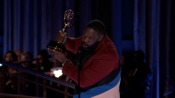 Adam Blackstone accepts the Emmy for Music Direction for The Pepsi Super Bowl LVI Halftime Show Starring Dr.Dre at the 2022 Creative Arts Emmy Awards.
