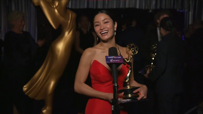 Anna Sawai talks to the Emmys Thank You Cam after winning for Outstanding Lead Actress in a Drama Series for Shōgun.