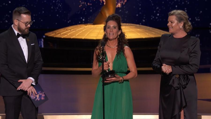 The team from The Studio accepts the Emmy for Production Design For A Narrative Program (Half-Hour) at the 2025 Creative Arts Emmy Awards.