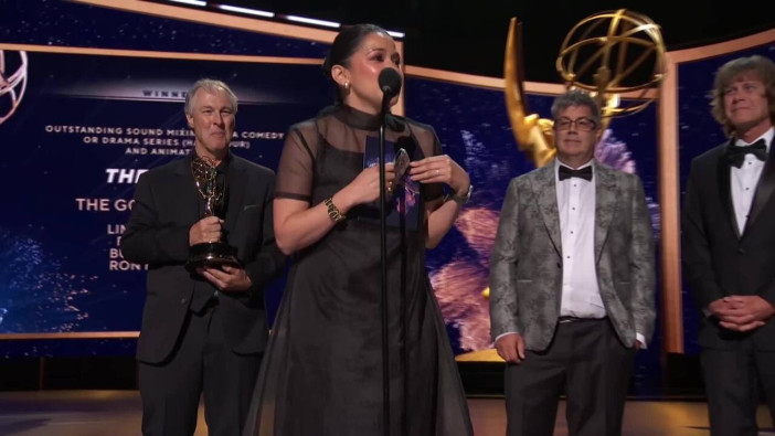The team from The Studio accepts the Emmy for Sound Mixing For A Comedy Or Drama Series (Half-Hour) And Animation at the 2025 Creative Arts Emmy Awards.