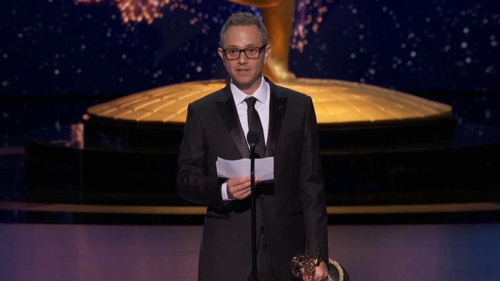 Gabe Hilfer from The Studio accepts the Emmy for Music Supervision at the 2025 Creative Arts Emmy Awards.