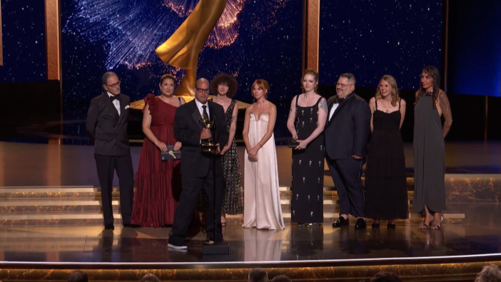 The team from Saturday Night Live accepts the Emmy for Outstanding Production Design For A Variety Or Reality Series at the 2025 Creative Arts Emmy Awards.