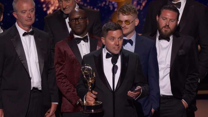 The team from The Traitors accepts the Emmy for Cinematography For A Reality Program at the 2025 Creative Arts Emmy Awards.