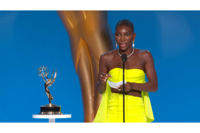 Michaela Coel wins the Emmy for Writing for a Limited or Anthology Series or Movie at the 73rd Emmys.