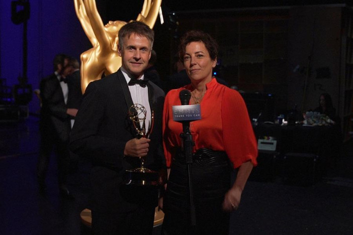 Nina Gold and Robert Sterne of The Crown with the Emmy for Casting for a Drama Series.