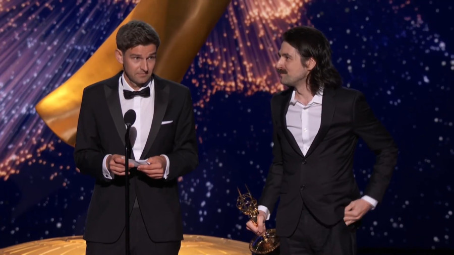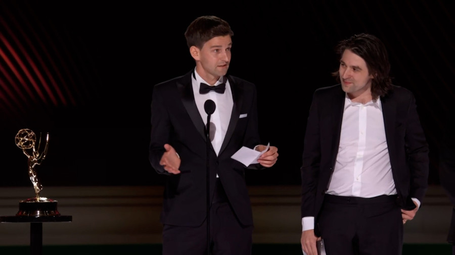Oliver Latta and Teddy Blanks from Severance accepts the Emmy for Title Design at the 2025 Creative Arts Emmy Awards.