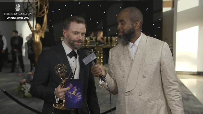 Philip Barantini from Adolescence talks to Albert Lawrence backstage at the 77th Emmy Awards after winning the Emmy for Directing For A Limited Or Anthology Series Or Movie.