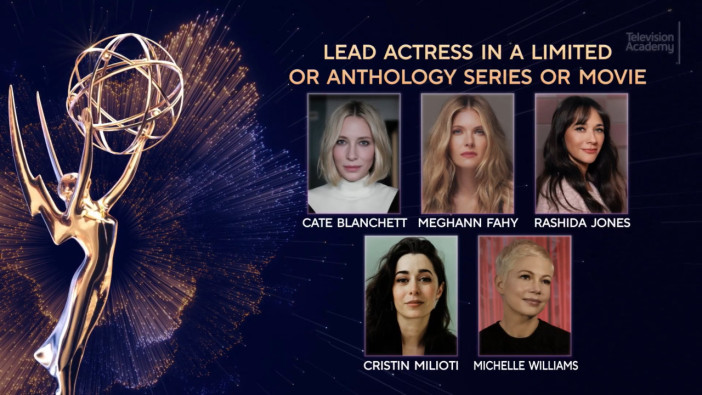 The nominees for Outstanding Lead Actress in a Limited or Anthology Series or Movie are Cate Blanchett, Meghann Fahy, Rashida Jones, Cristin Milioti, Michelle Williams.
