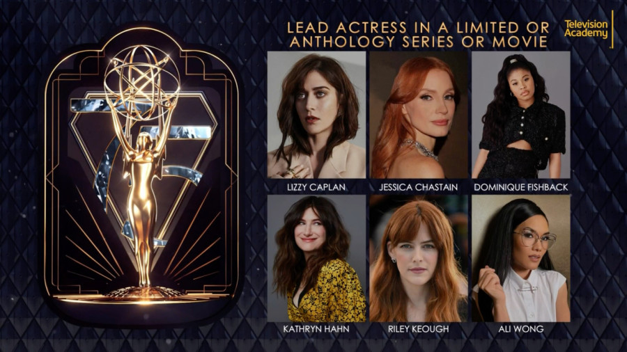 The nominees for Outstanding Lead Actress in a Limited or Anthology Series or Movie are Lizzy Caplan, Jessica Chastain, Dominique Fishback, Kathryn Hahn, Riley Keough, and Ali Wong.