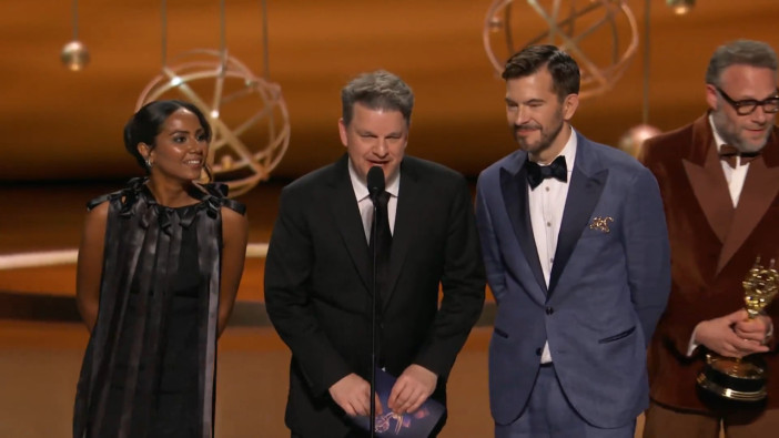 Seth Rogen and Evan Goldberg from The Studio talk to the Emmys Thank You Cam after winning for Outstanding Directing for a Comedy Series.