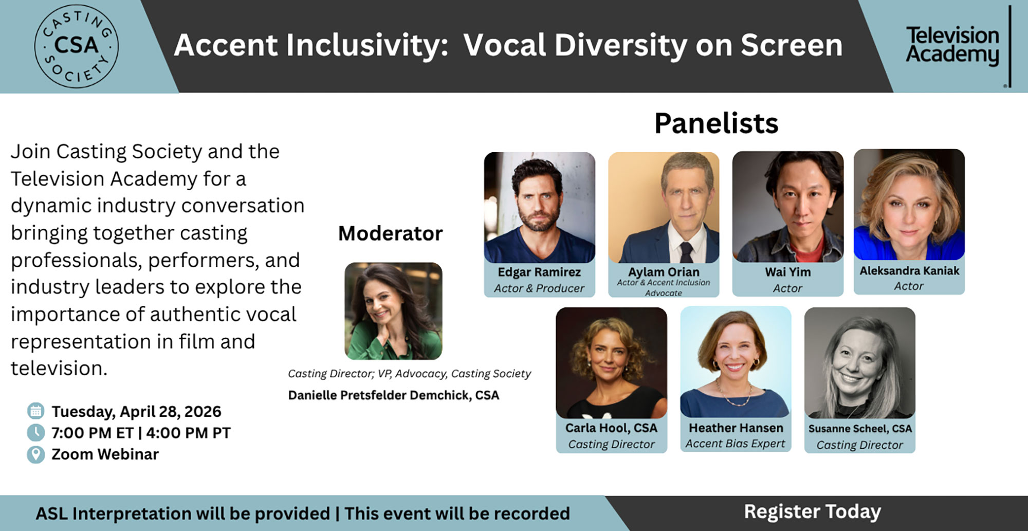 Join Casting Society and the Television Academy for a dynamic industry conversation bringing together casting professionals, performers, and industry leaders to explore the importance of authentic vocal representation in film and television.