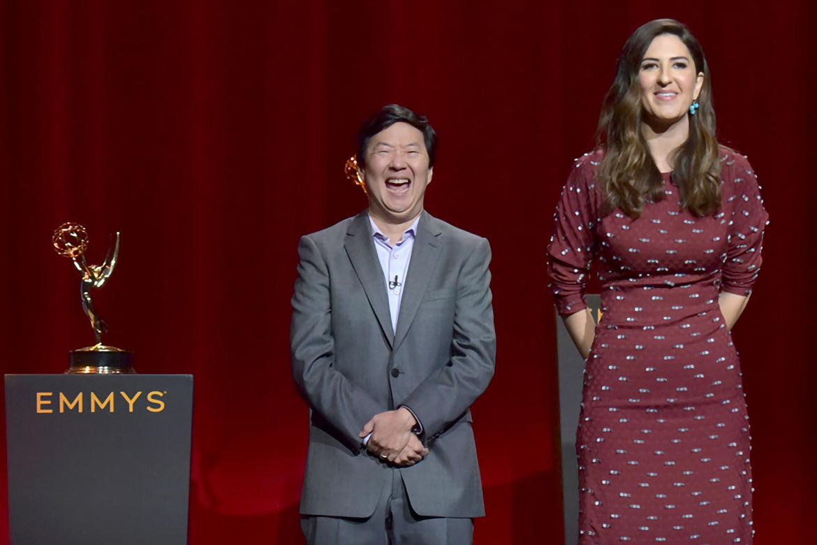 Television Academy Chairman and CEO Frank Scherma with celebrity presenters Ken Jeong and D'Arcy Carden announced the nominees for the 71st Emmy Awards on July 16, 2019.