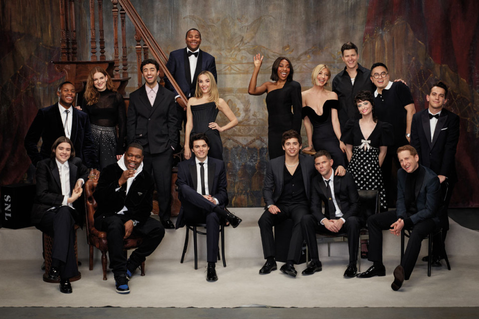 Emmy is marking the milestone as well. Behold our cover, featuring all 17 cast members shot by the show's longtime photographer, Mary Ellen Matthews, on a hectic Thursday night after rehearsals for an episode hosted by Rock. "It was a very busy day, so this was quite a feat," Matthews says. The ensemble and behind-the-scenes talent also talked to emmy about the show's past, present and seemingly endless future.