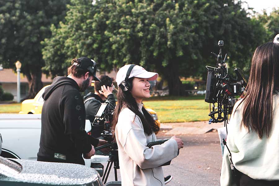 Yaxing Lin on the set of ReelShort’s Ms. Swan, Teach Me Love
