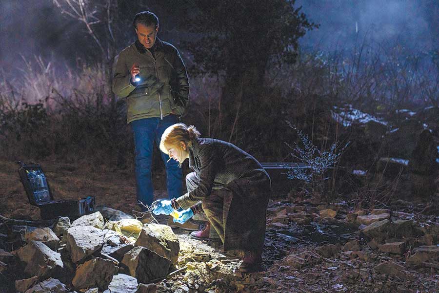 Nelson breaks down each episode’s script, discussing with the director and Hawes what special effects are needed, before he designs the body parts with Van Dyke. Sometimes an actor is made up with prosthetics; other times, a fake body is needed. "In the first episode, for example, we were considering [using the actress for] a scene of the victim’s body by the railroad tracks," Nelson says. "But then we realized we’d be shooting outside, at night, in November, in Nashville. It would be very cold, dirty and miserable to do that to an actress. So, we decided to make a dummy."
