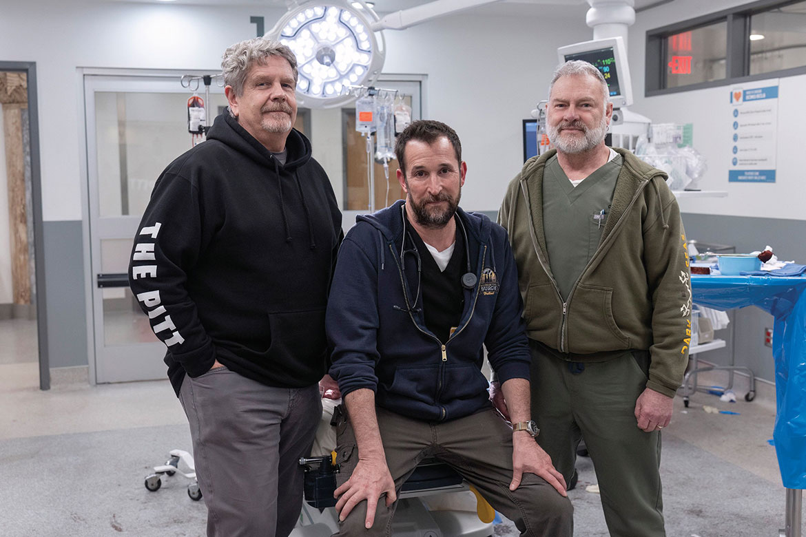 John Wells, Noah Wyle and R. Scott Gemmill on the set of The Pitt. Photo Courtesy: Warrick Page/Max
