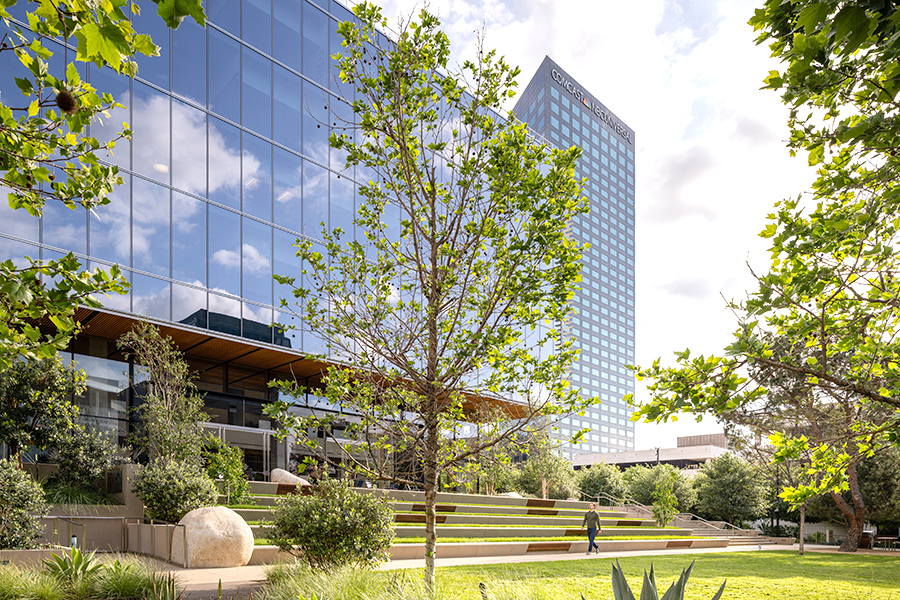 If the Commons is the heartbeat of the campus, One Universal is the brain. The 11-story office building overlooks a lawn used for events and outdoor movie screenings; its broad entrance stairs serve as stadium-style seating. In keeping with the indoor-outdoor philosophy, One Universal is adjacent to outdoor conference rooms that offer air conditioning and TVs.