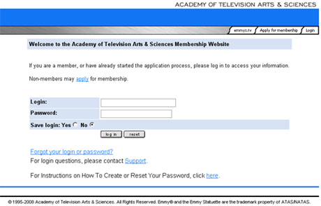 Step #1 - Go to www.emmys.com click on the yellow Member Login tab near the top of the page Step #2 - Click on the “Forgot your login or password?” link Step #3 - When prompted, enter your email address, then hit submit Step #4 - Go into your email account inbox and look for an email from membership@emmys.org and click on the link provided to reset your password Step #5 - This will open up a web page where you must input your first name, last name and new password. Note that your user login is on top of this page. It’s usually your first initial and last name with no space or dot in between (e.g. WSMITH) Step #6 - Hit submit and try logging in again If you encounter any problems, contact loginsupport@emmys.org.