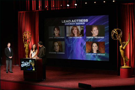 North Hollywood, CA – Stars Julia Louis-Dreyfus and Brad Garrett not only assisted Television Academy Chair Dick Askin in unveiling the 2006 Primetime Emmy nominees, the three inaugurated a brand new nominations ceremony set.