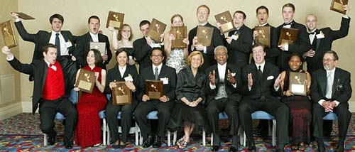 | College Television Awards winners with Educational Programs and Services Director Price Hicks, EPS Committee member Victor Webb (next to Hicks), host Chris McDonald (next to Webb) and EPS Co-Chair Bruce Bilson (first row on the right). |