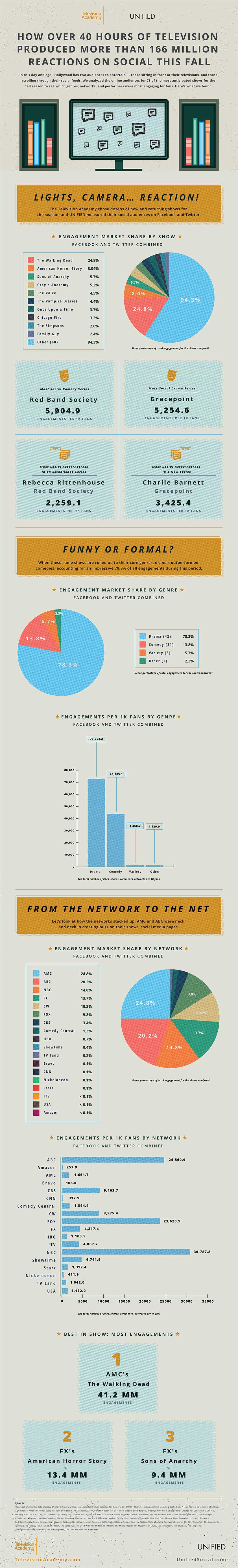 In order to remain relevant in a world that can change its focus faster than you can push a button on your remote control, today’s stars, shows and networks must make sure they engage their social media fans in addition to their television audiences. With the help of UNIFIED Marketing, we looked at this year’s fall premieres to determine which genres, shows and performers deserved a shout-out.