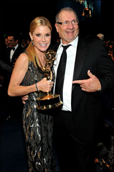 The evening got off to a rousing start with a pre-taped musical number featuring host Jane Lynch singing and visiting the sets of several series (“Oh, I hate it when musical numbers come through our apartment!” snapped Jim Parsons, in character as Sheldon Cooper, in the living room of The Big Bang Theory) and getting in a pertinent jab or two. (“Sweetheart, can you get us some coffee?” asked Mad Men's Jon Hamm, as the chauvinistic ad executive Don Draper. “You’re hilarious,” Lynch fired back. “I’m not a secretary, I’m the host of the Emmys.”