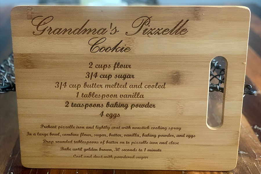 Unfortunately, when my grandmother passed away in 2018, the kids thought the tradition was over. That Christmas, I frantically called my mom. The kids were sitting around the table anxiously waiting for the fun to begin, and I could not remember the recipe. My mom listened to my shaky, tearful question, and calmly said, "Go look under the tree and grab the package with the brown paper wrapping. Open it." Inside was the most beautiful wooden cutting board with Grandma's pizzelle recipe engraved on it.