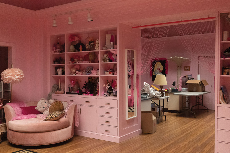 "Pink" was the operative word for production designer Jamie Hall and her team, who used the color only subtly in the early part of the story, usually in happier moments involving Angelyne's mother, who died of cancer when the girl was fourteen. "As [Ronia, who went by Renee in school] evolved into Angelyne, that's when you start seeing the pink," says Hall, who took over from original production designer Jahmin Assa when production resumed after an early pandemic shutdown.