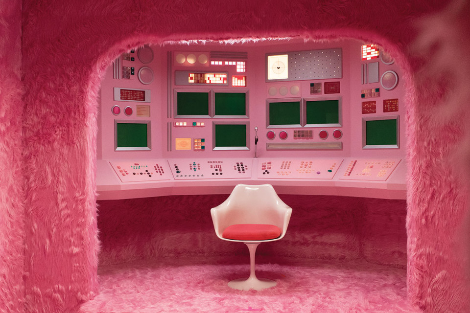 There's safe space, and then there's outer space. Hall read an interview in which Angelyne discussed a spiritual moment she had in the 1980s when she first experienced the powerful vibrations of the color pink — on her home planet, which she'd left to come to Earth and to which she had been trying to return. For a fantasy sequence, Hall created that pink planet, called Angelyne Land in the show, in which the apartment bathroom is transformed into a multi-pink-hued control room where Angelyne can see and control her life on Earth.