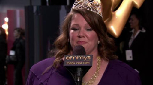 All the ladies screamed and hugged, and Melissa was presented with a dozen roses and the Emmy, while a tiara was plopped on her head. It was a delicious moment. All awards should be presented this way.