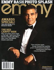 A tuxedo-clad George Clooney looks dapper on the cover of the "Emmy Bash Photo Splash" issue of the award-winning emmy® Magazine. In its first-ever keepsake issue, the only comprehensive collection of photography capturing all of the excitement from television’s biggest night, "Emmy Bash Photo Splash" includes more than 250 exclusive images from the red carpet arrivals, stars in the audience, behind-the-scenes, the Governor’s Ball and the Creative Arts Awards, as well as the Primetime Emmy Awards telecast’s most memorable moments. Emmy® magazine is the official publication of the Academy of Television Arts & Sciences. This 64-page special edition issue hits newsstands on September 14. A limited number of issues will be available to the public on a first-come, first-served basis at www.emmys.com. To purchase this special issue, click here. Digital editions of the magazine are also available for purchase on www.zinio.com. At the 62nd Primetime Emmy Awards, George Clooney received the Bob Hope Humanitarian Award. Reflecting the life and accomplishments of entertainment legend Bob Hope, the award is presented to an individual in the telecommunications industry whose humanitarian work has brought credit to the industry and whose deeds and actions have a lasting impact on society. Clooney is only the third person to receive this prestigious award. Oprah Winfrey and Danny Thomas (presented posthumously and accepted by his daughter, actress Marlo Thomas) are the only other recipients since the award’s establishment in 2002. Outstanding Actress in a Drama Series nominee Julianna Margulies, who presented the honor to her former ER co-star, described Clooney as “A true driving force behind remarkable TV events like America: A Tribute to Heroes, Tsunami Aid: A Concert for Hope and, most recently, the Hope for Haiti Now telethon. Time and time again, George Clooney has used the power of television to raise money where it is needed most and to transform hopelessness into hope.” “It’s important to remember how much good can get done, because we live in such strange times where bad behavior sucks up all the attention and the press,” said Clooney upon accepting his award. “And the people who really need the spotlight — the Haitians, the Sudanese, people in the Gulf Coast on the five-year anniversary [of Hurricane Katrina], the people of Pakistan — they can’t get any.” One of the big night’s key destinations was emmy® magazine’s backstage portrait studio, with its luxurious golden-walled set, where winners and presenters, including Clooney as well as Bryan Cranston, Jane Lynch, Al Pacino, Edie Falco, Eric Stonestreet, Kyra Sedgwick, Jim Parsons, Claire Danes, the casts of Modern Family, Mad Men and True Blood and many more, posed for premier photographer Charles Bush for "Emmy Bash Photo Splash." “It was a great evening and people loved our set,” said Charles Bush. “It gave us great opportunities for different pictures and it set the tone for some really wonderful shooting.” Purchase information is available here.