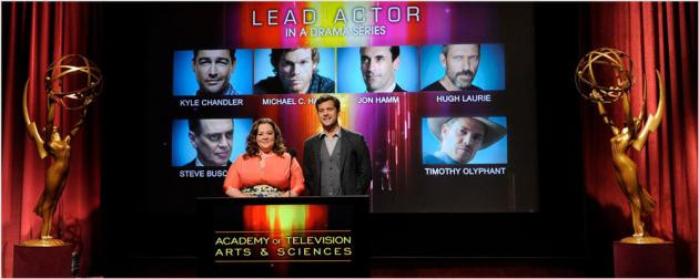 Celebrity hosts Melissa McCarthy of Mike & Molly and Joshua Jackson of sci-fi drama Fringe revealed this year's nominations for the 63rd Primetime Emmy® Awards, along with Television Academy Chairman and CEO John Shaffner, live from the Academy of Television Arts & Sciences in North Hollywood, California, on July 14, 2011. The 63rd Primetime Emmy Awards eligibility period covers June 1, 2010 through May 31, 2011. Nearly half the Comedy and Drama Series Nominees are First-Timers Five of the twelve nominated Comedy and Drama series are first time nominees this year, and seven of the twelve are network programs. New among the outstanding drama series nominees are Boardwalk Empire, Game of Thrones and Friday Night Lights; for outstanding comedy series, first time nominees are The Big Bang Theory and Parks and Recreation. Boardwalk Empire, Modern Family, More Among Programs Garnering 10+ Noms Programs receiving ten or more nominations are Mildred Pierce, Mad Men, Boardwalk Empire, Modern Family, Saturday Night Live, Game of Thrones, 30 Rock, Glee, Downton Abbey (Masterpiece), Too Big To Fail, American Idol and The Kennedys. Lots of First-Time Nominees and Familiar Faces Recognized in New RolesThis year’s outstanding comedy series performer categories feature a slew of familiar faces being recognized with an Emmy nomination for the first time, or for the first time in these particular comedy roles. They include: