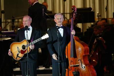 The western medley was one of several performed, with other medleys saluting detective shows and composers Jerry Goldsmith (The Man from U.N.C.L.E., Dr. Kildare, The Waltons) and Earle Hagen (The Dick Van Dyke Show, That Girl, The Mod Squad). Hagen, celebrating his eighty-fifth birthday that night, was introduced onstage by Robert Culp, star of the Hagen-scored I Spy. Played in full were David Schwartz's Deadwood and Danny Elfman's The Simpsons, Steve Allen's "This Could Be the Start of Something Big" and Luciano Michelini's Curb Your Enthusiasm, the latter underscoring a montage of sitcom clips on the Bowl’s new video screens. A touching tribute to the late stars of Mister Rogers and Captain Kangaroo, performed by Gregory Jbara, David Newell and the Karousel Kids, was another highlight, as was a politically-pointed comic routine by TV’s ‘60s bad boys Tom and Dick Smothers.