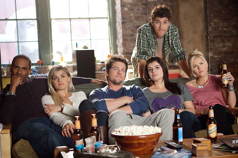 The cast of Happy Endings (from left): Damon Wayans, Jr., Eliza Coupe, Zachary Knighton, Casey Wilson, Adam Pally and Cuthbert