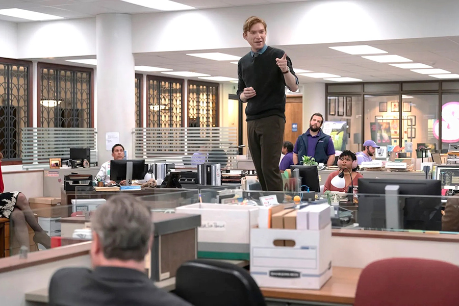 The rest of the newsroom is filled out by a mix of familiar and new-ish faces. “They’re super people and super actors,” Gleeson offers. Chelsea Frei (The Life List) is Mare, a former military reporter who develops a Jim-and-Pam-like flirtation with Ned. Melvin Gregg (American Vandal) plays Detrick, who harbors a crush on coworker Nicole (Never Have I Ever’s Ramona Young). Alex Edelman (Just for Us) and Gbemisola Ikumelo (A League of Their Own) toil in the accounting department — and just like some Office alums, they’re on the show’s writing staff, too.