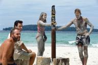 The first season of Survivor was set on the island of Borneo, where contestants included Richard Hatch (the eventual winner}, Kelly Wiglesworth and Rudy Boesch, seen here with Probst.