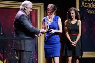 Andy Sale of Ernst and Young presents an award to Sarah Nolen at the 36th College Television Awards at the Skirball Cultural Center in Los Angeles, California, April 23, 2015.
