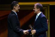 Antonio Camberos accepts his award from Robert Kovacik at the 67th Los Angeles Area Emmy Awards July 25, 2015, at the Skirball Cultural Center in Los Angeles, California.