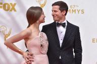 Joanna Newsom and host Andy Samberg on the red carpet at the 67th Emmy Awards.