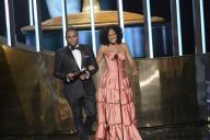 Anthony Anderson and Tracee Ellis Ross present an award at the 67th Emmy Awards.
