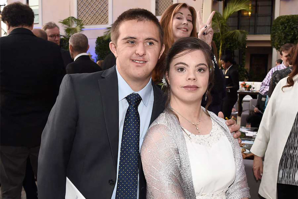Born This Way cast members Sean McElwee and Cristina Sanz, being photobombed by Dana Delany
