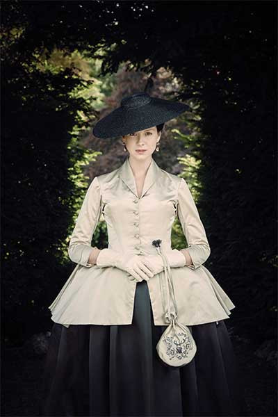 Fashion trends tend to be cyclical; here Balfe is wearing a dress based on a 1947 Christian Dior design. “This is our version of the infamous Bar Suit, complete with platter hat,” Dresbach says. “Think Grace Kelly. It’s a piece of fashion that just keeps coming back.” The purse is based on an 18th-century design, but Dresbach’s crew took it a step further, embroidering a stag’s head as a nod to her husband’s Scottish roots.