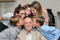 Bob Newhart gets a birthday kiss from his grandchildren at The Rise of the Cerebral Comedy: A Conversation with Bob Newhart, presented Tuesday, Aug. 8, 2017, at the Television Academy's Wolf Theater at the Saban Media Center in North Hollywood, California.