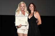 Stunt coordinator Julie Michaels accepting the nomination on behalf of Brian Smyj, and Television Academy Governor Dorenda Moore seen at the Television Academy stunts nominee reception at the Television Academy's Wolf Theatre on Saturday, Aug. 26, 2017 in Los Angeles.