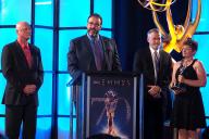Randy Hutson, from left, Chris Conti, PRG Product Manager, Charles Reese, and Diane Miller accept the Engineering Emmy Award for PRG GroundControl Followspot at the 2018 Engineering Emmy Awards