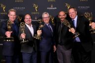 Bart Thielen, from left, Andy Logan, John Maier, GM of Blue, Adam Castillo, and Kevin Walt pose with the Engineering Emmy Award for Blue Mix-Fi Headphones at the 2018 Engineering Emmy Awards