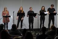 Laura Snow, McKenna Slone, Channing Apodaca, Claire Chapelli, and Mark Reininga participate in the reading of a new teleplay during the Young Writers to Watch Showcase at the Television Academy's Saban Media Center on Wednesday, January 16, 2019 in North Hollywood, California.
