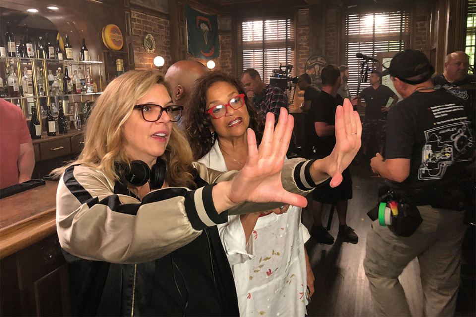 Krista Vernoff on the set of Grey’s Anatomy with director–executive producer Debbie Allen