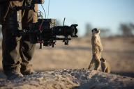 Cameraman Tom Walker uses a gyro-stabilized camera to film meerkats (Suricata suricatta) in the Kalahari Desert.