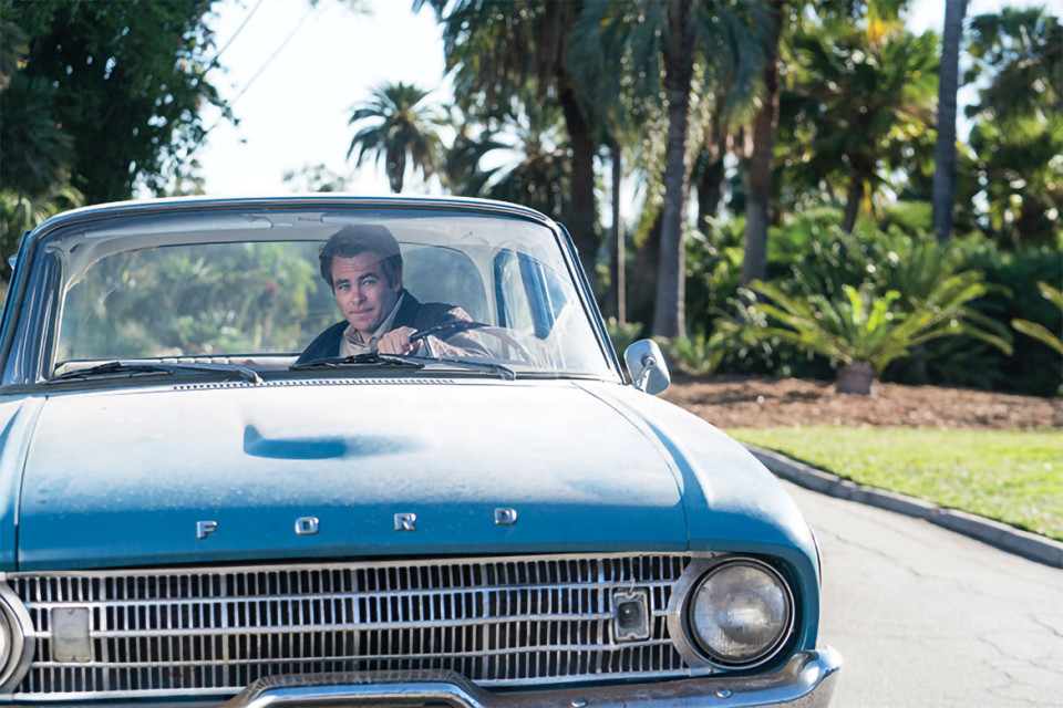 Chris Pine, as disgraced journalist and Korean War vet Jay Singletary, pursues the truth in his Ford Falcon.